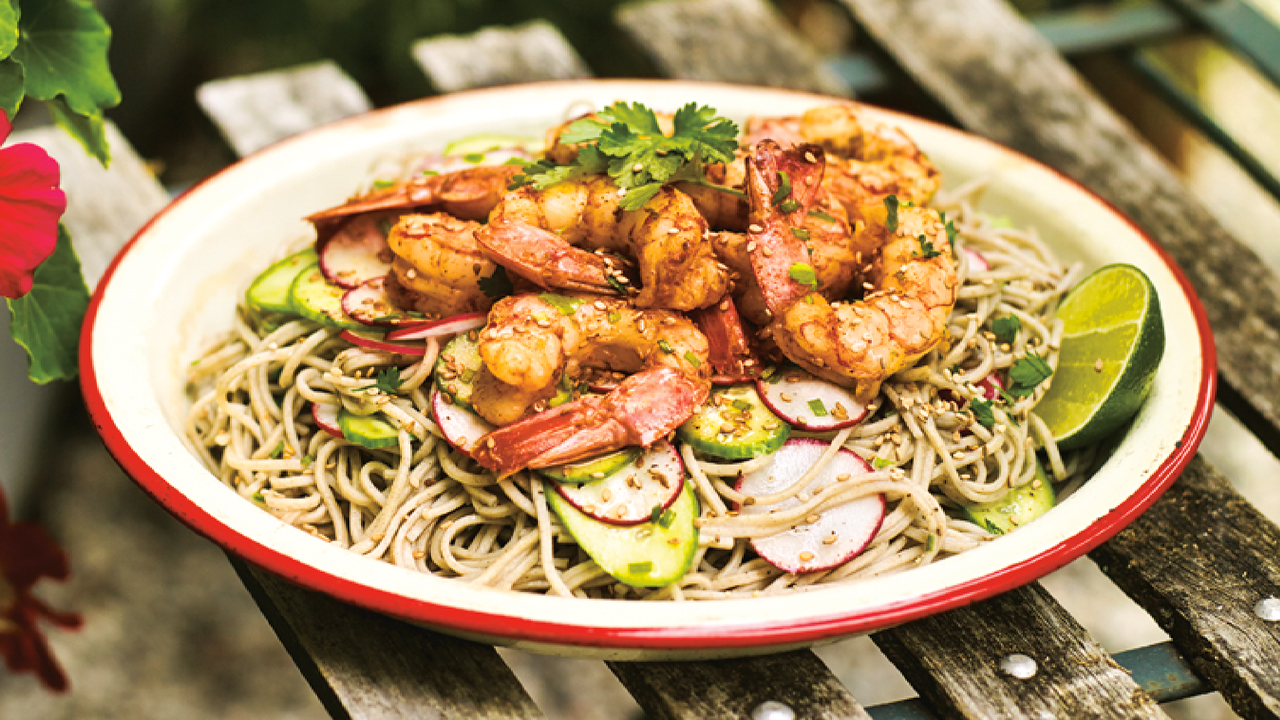 « Les crevettes grillées et épicées contrastent agréablement avec les concombres frais et la touche vinaigrée des nouilles et de la sauce. » – Rosie Daykin