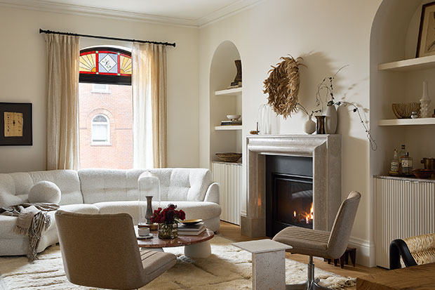 Dans le salon de la designer Lyndsay Jacobs, un canapé récemment rembourré trouvé sur Kijiji, des chaises vintages et des objets rapportés des voyages du couple donnent à l’espace un aspect multidimensionnel. Les vitraux récupérés de la maison d’origine ajoutent à l’atmosphère patrimoniale.