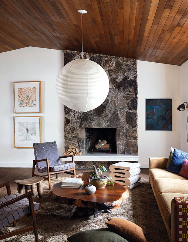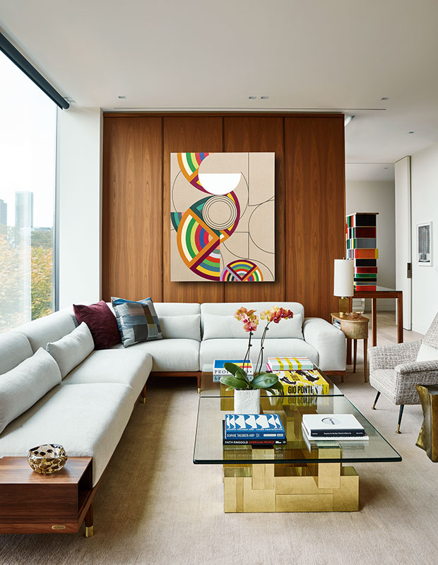 Le style partagé par ce couple se reflète dans les œuvres d’art et les meubles qu’ils ont collectionnés au fil des décennies. « Il était tellement beau, avec son tissu en chenille raffinée et sa couleur oyster chaleureuse », explique le designer Neil Jonsohn à propos du canapé bas acheté lors d’un voyage avec les propriétaires Debra et Barry Campbell. Son profil et ses pieds en laiton brossé s’harmonisent parfaitement avec les tables basses Paul Evans. La lampe de table est un modèle Stiffel en laiton datant des années 1940.