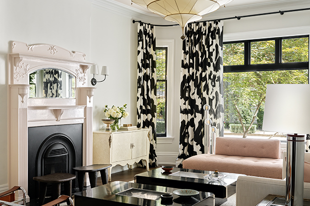 L’ambiance à la fois traditionnelle et moderne de ce salon conçu par TOM Design Studio est mûrement réfléchie et soigneusement orchestrée. « J’aime toujours ajouter une touche rebelle à mes jolies créations », explique Tommy, en soulignant des détails tels que les rideaux graphiques réalisés sur mesure pour le salon. La designer associée Haley Dermenjian adore le mélange des styles et des époques. « Introduire des meubles, des textiles et des luminaires qui allient l’ancien et le nouveau permet de créer une histoire multidimensionnelle », explique-t-elle.