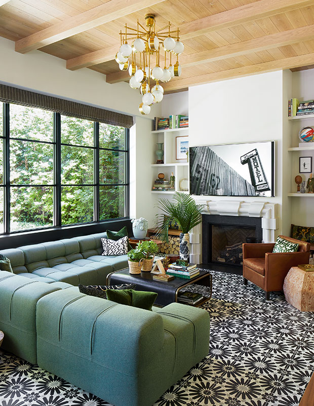 Pour en arriver à ce magnifique salon, la designer Colette van den Thillart a transformé un garage en une « pièce-jardin » qui s’intègre parfaitement à l’extérieur. Un sol en carreaux de ciment encaustique, un canapé vert et un lustre d’inspiration Art déco ajoutent de la gaieté et de la fantaisie à l’espace.