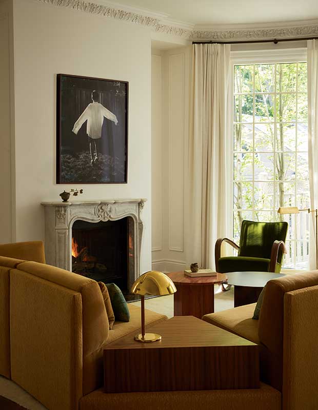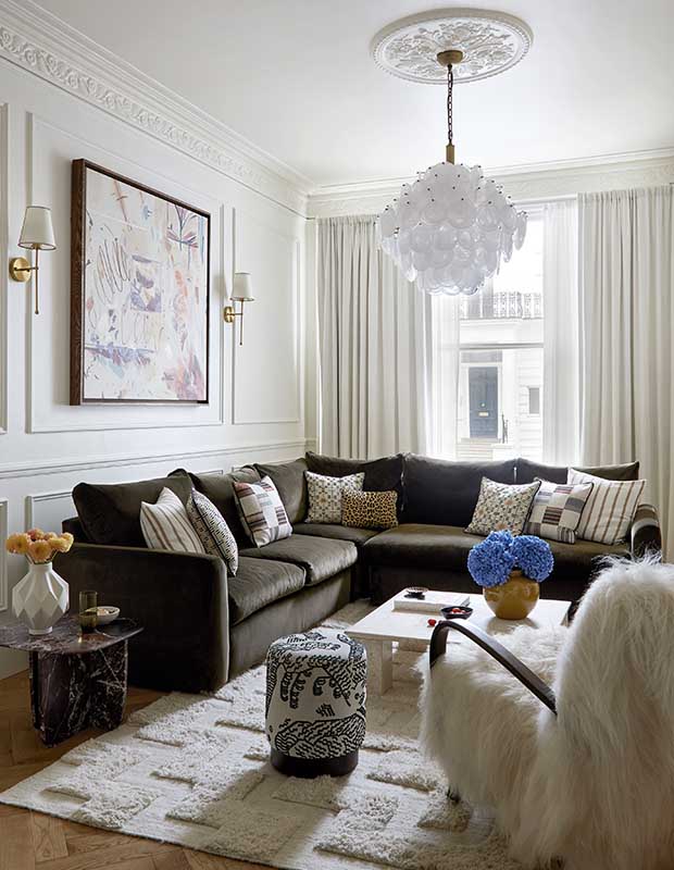 Le mélange de l’ancien et du nouveau se retrouve dans le condo de la designer Amanda L. Hoyle à Notting Hill. Le tableau accroché dans le salon a inspiré la palette de couleurs de la maison, tandis qu’un luminaire contemporain ajoute une note d’originalité à la corniche d’origine.