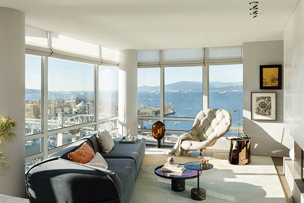 « Nous avons cherché à créer un style sophistiqué et cosmopolite », explique la designer Kelly Reynolds à propos de ce pied-à-terre à Vancouver. Le salon offre une vue panoramique sur le pont Burrard Street Bridge et sur English Bay, au loin. Un tapis dégradé reprend les teintes bleues, vertes et dorées de l’extérieur. Un mélange harmonieux de tables, d’œuvres d’art et de sièges donne du caractère à cet espace blanc immaculé.
