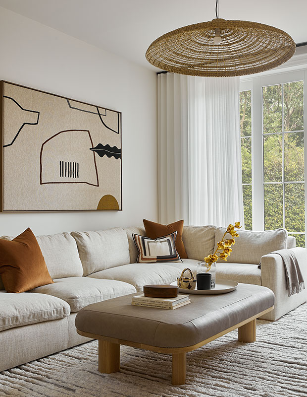 « Au-delà de l’esthétique, je veux que chaque maison reflète la personnalité de ses propriétaires », explique Jessica McGouran, de Jessica Leigh Interiors. Une suspension Pinch domine la pièce, tandis qu’un tapis géométrique apporte une touche de fantaisie à l’espace. « La lampe est fabriquée à partir de fibre de banane moulée et ajoute une texture intéressante », ajoute-t-elle.