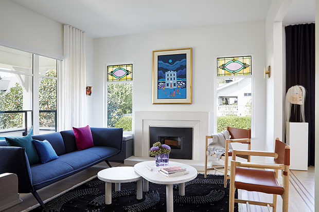 Dans ce salon sis à Kistilano, le designer Ben Leavitt, du studio PlaidFox, a incorporé des nuances de bleu et de violet vifs, s’inspirant des vitraux d’origine. « Nous voulions moderniser la maison avec sensibilité pour une famille moderne qui aime la couleur », explique l’architecte Jason Skladan.