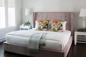Un rail à crochets chevilles de style Shaker se fond merveilleusement dans les murs en perle, tandis que des coussins bleu aquatique apportent du confort et rendent hommage à cette oasis de campagne située au bord d’un lac.