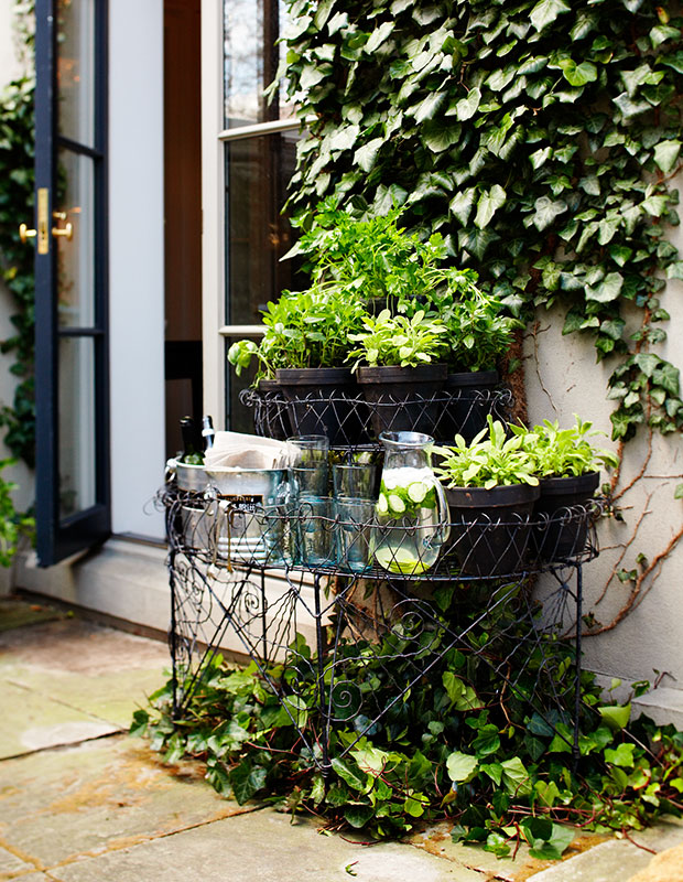 Transformez un support à plantes en mini-bar, comme l’a fait Lynda Reeves avec un assortiment d’herbes en pot. Il peut accueillir pichets, seaux à glace et verres pour vos invités. Installer un coin bar dès maintenant vous permettra de recevoir avec style lorsque les températures commencent à chuter.
