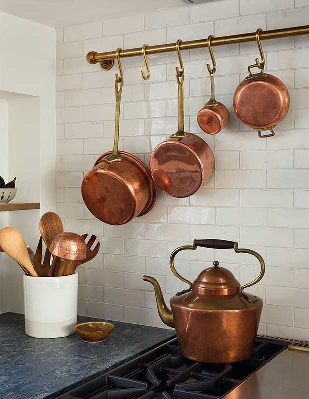 Les clients d’Audrée ont acheté ces vieux pots avant même le début du projet. « Les pots en cuivre ajoutent du charme et de la couleur à un espace neutre », explique Audrée.