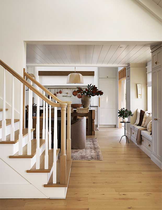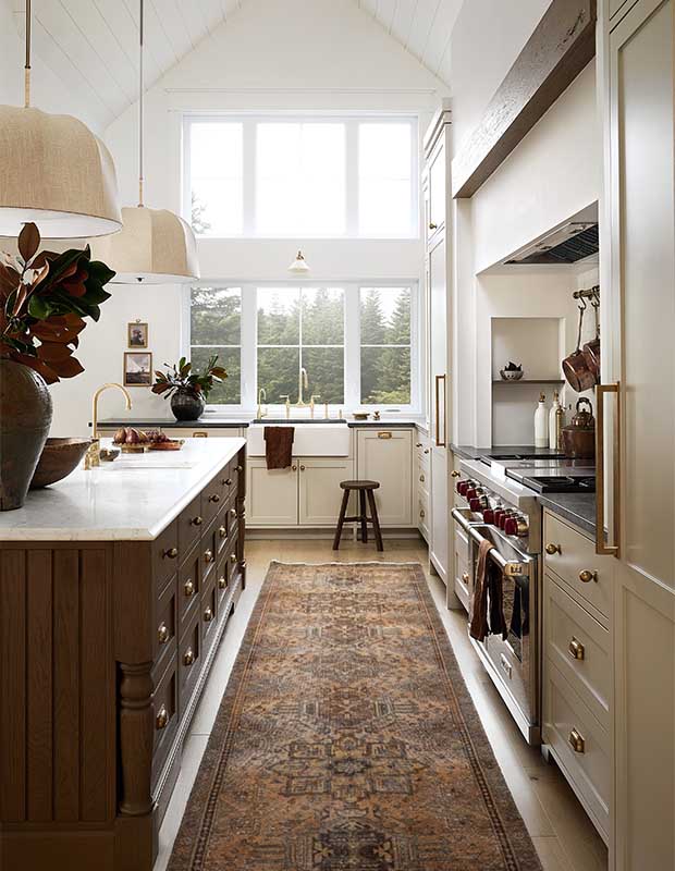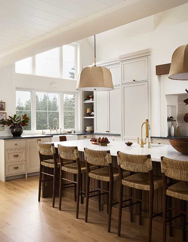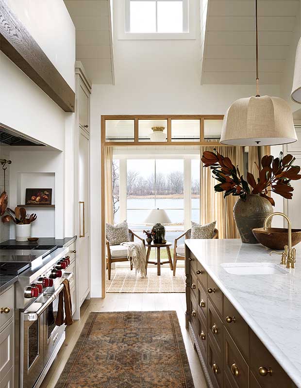 Comme la cuisine n’a pas de fenêtres donnant sur la rivière, Audrée a dû faire preuve d’ingéniosité pour profiter de la vue. « Le coin salon est la pièce préférée de tout le monde », dit-elle. « On peut s’y asseoir confortablement et admirer la rivière tout en restant dans l’action de la cuisine. » Pour tirer parti des hautes fenêtres panoramiques, elle a ajouté une grande imposte au-dessus de la porte de la cuisine et l’a encadrée de chêne blanc. Une autre fenêtre au-dessus prolonge la vue vers le ciel et apporte plus de lumière dans la cuisine.