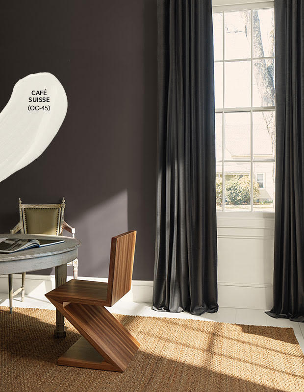 Silhouette est une teinte terre brûlée qu’on peut utiliser pour envelopper complètement un espace ou combiner avec d’autres couleurs, comme Caffé Suisse (OC-45) « Tout brille à ses côtés », affirme Andrea. « C’est comme s’envelopper dans une couverture. Cette couleur entre en harmonie avec les tissus texturés, comme le bouclé et les tapis tissés. »