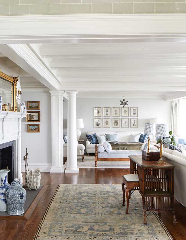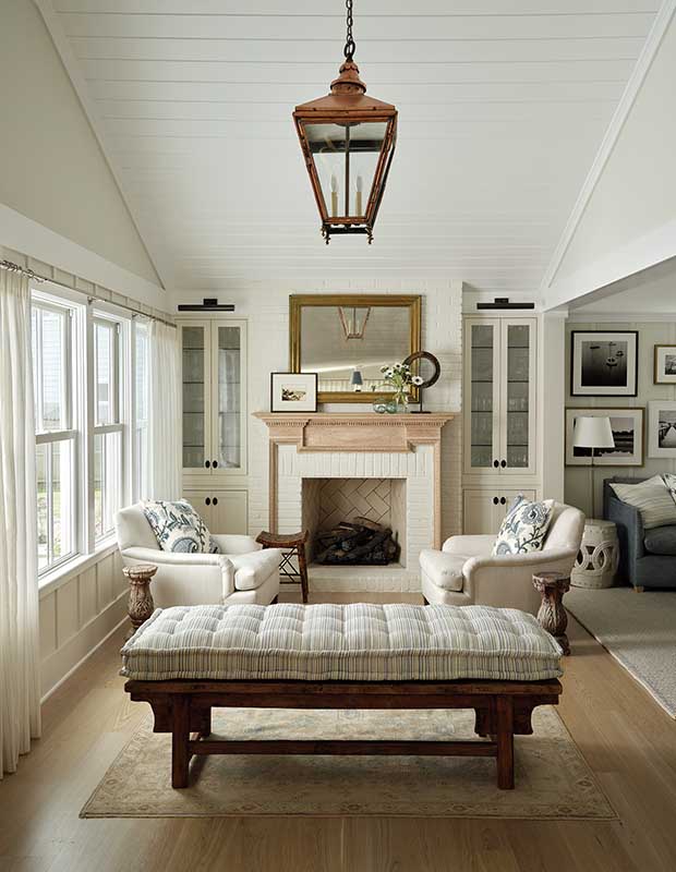 Les éléments de récupération architecturale, comme cette cheminée non peinte, sont une signature de Tommy, comme on peut le voir dans cette maison en bord de mer au Connecticut.