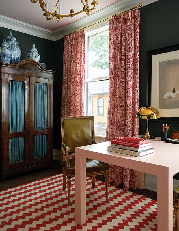 Le bureau à domicile de Katherine est un mélange ravissant de pièces modernes et anciennes. Tissu pour rideaux, Memo Showroom ; bureau, Cabinet ; tapis par Madeline Weinrib, Y&Co.