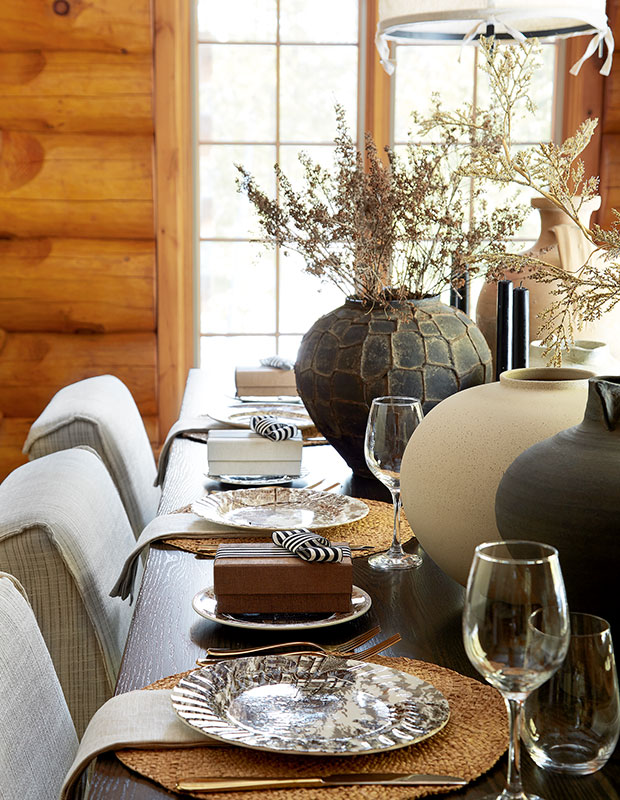 Matthew et Rick Bettencourt ont opté pour une décoration de Noël naturelle dans leur chalet rustique, privilégiant les tons neutres et terreux plutôt que la verdure. Des fleurs séchées cueillies autour de leur propriété à la campagne sont disposées dans de grands vases vintage. Chaque invité trouve à sa place un cadeau joliment emballé dans une petite boite plutôt que les traditionnels crackers de Noël.