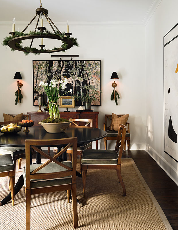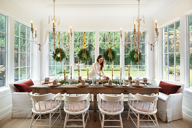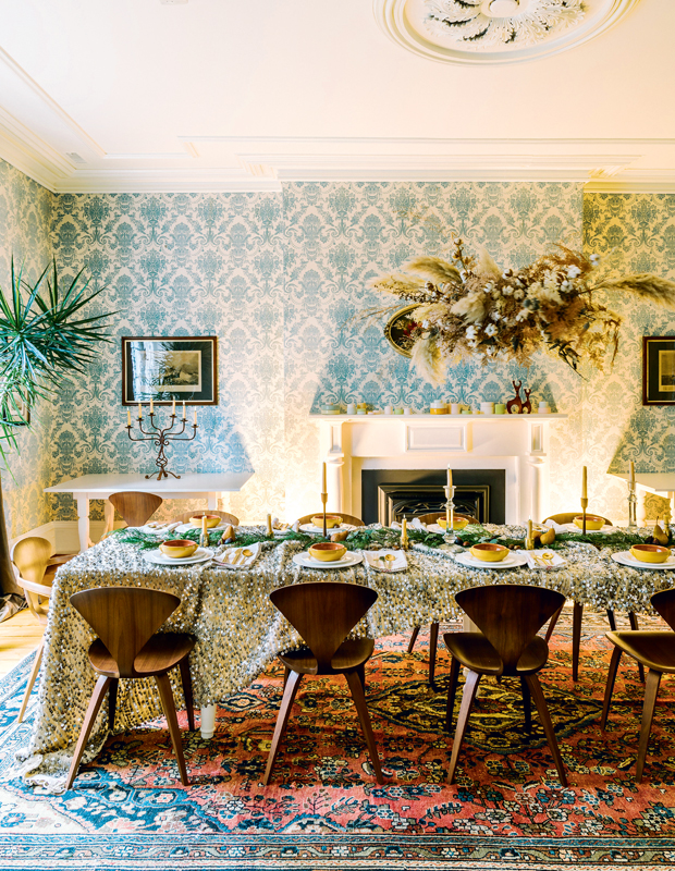 « Pour moi, les fêtes sont synonymes de clémentines, de branches naturelles et de verdure qui embaument la maison », explique la designer Cynthia Zamaria. Dans sa salle à manger féérique, elle a décoré la table avec des pommes grenades fraîches, des tranches d’orange séchées et un mélange éclectique de bougies.
