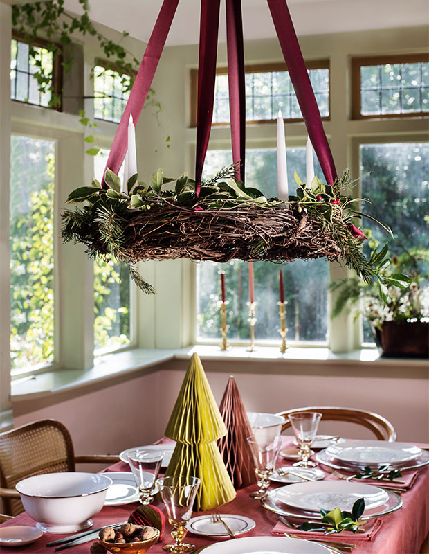 Renouvelez votre décoration de fêtes en choisissant une couleur signature inattendue pour harmoniser votre table. Une teinte rose prune est utilisée pour le ruban de la couronne, le linge de table et les décorations en papier plié.