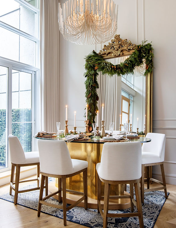 Le propriétaire de cette maison de ville à Vancouver voulait une table à manger qui puisse également servir d’espace de travail. La designer Negar Reihani a donc conçu une table dorée sur mesure qui crée un décor magique pendant les fêtes. Un miroir orné d’un cadre doré et d’une généreuse guirlande de verdure ajoute une touche festive.