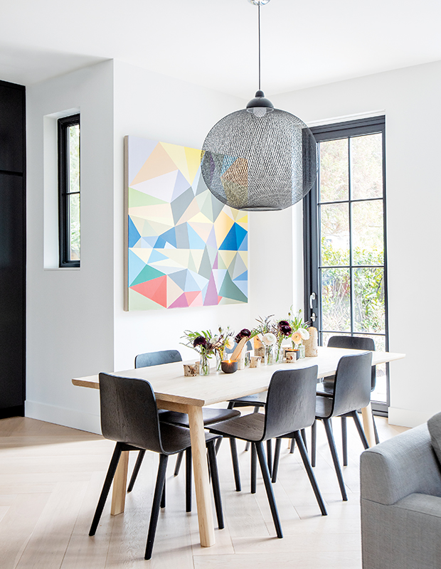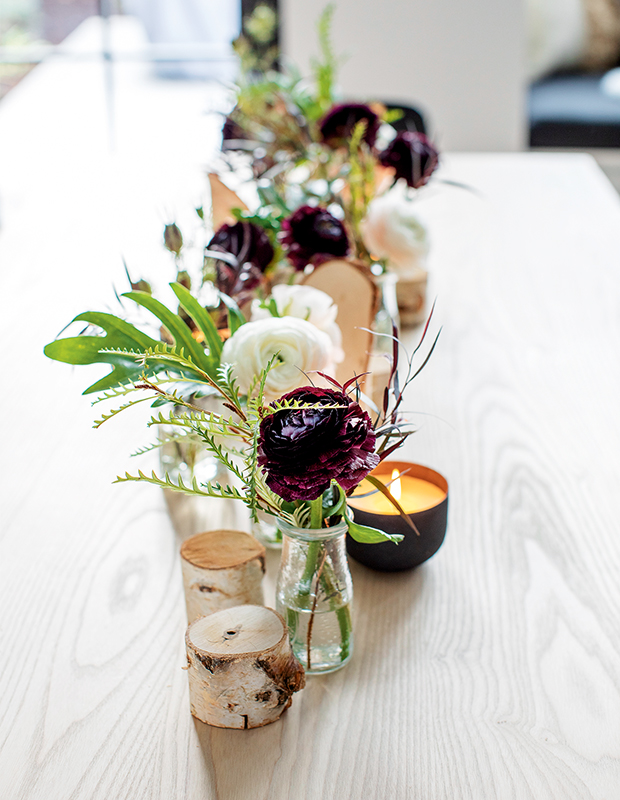 Lorsque vous décorez un espace plus contemporain, vous pouvez abandonner le grand poinsettia en pot au profit d’un arrangement déstructuré sur la table des fêtes. Pour ses clients de Kitsilano, en Colombie-Britannique, la designer Ami McKay a choisi un bouquet de verdure et quelques fleurs qu’elle a répartit dans de petits récipients. « Je voulais créer une ambiance chaleureuse et contrastée, avec des couleurs profondes, pour refléter les tons noirs de la cuisine », explique-t-elle.