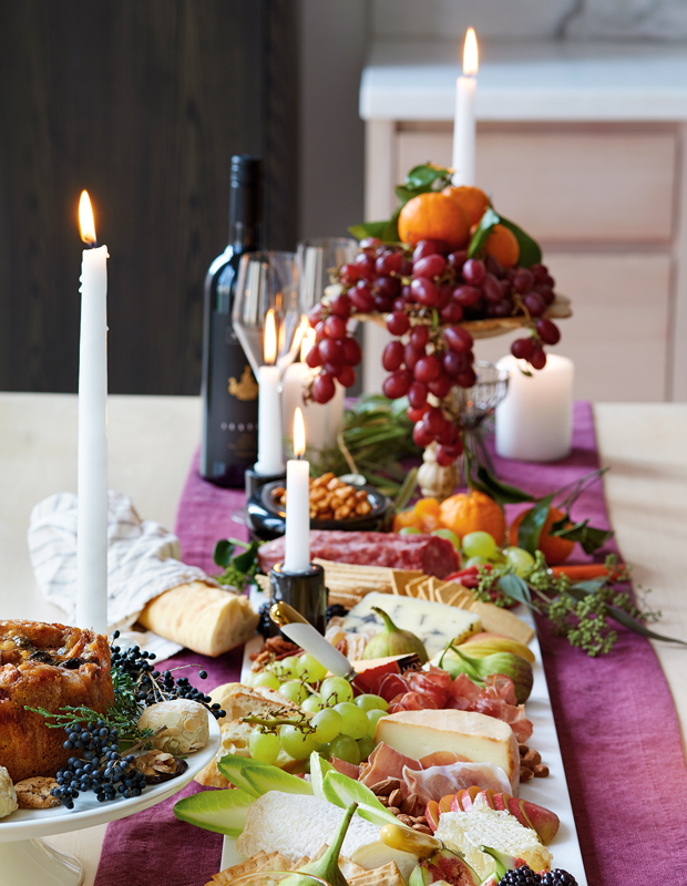 La designer Alison Milne a dressé sa table de salle à manger avec un délicieux plateau de charcuterie qui contraste avec le chemin de table couleur mûre. Ce style décontracté est parfait pour une réunion familiale intime.