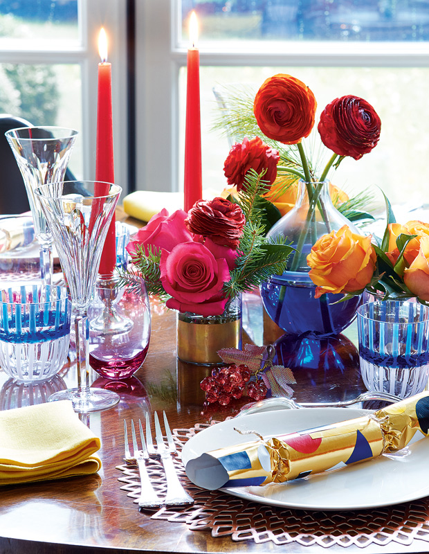 Lynda Reeves délaisse les couleurs traditionnelles et les poinsettias lorsqu’elle décore sa table pour les fêtes. Des napperons en or rose sont recouverts d’assiettes simples et d’une combinaison de flûtes à champagne en cristal Waterford, de verres à pied rose sans tige et de verres à eau peints. « Les serviettes en lin vert chartreuse sont un ancien ensemble que je chéris pour leur couleur étonnante, si difficile à trouver. » Enfin, les crackers faits à la main par Lynda Reeves apportent la touche finale.