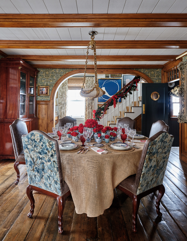 Ce cottage patrimoniale situé à Chester, en Nouvelle-Écosse, est un décor de conte de fées pour un dîner de Noël, avec une vaisselle dépareillée, des verres vintage couleur canneberge et de simples roses déposées dans des vases.