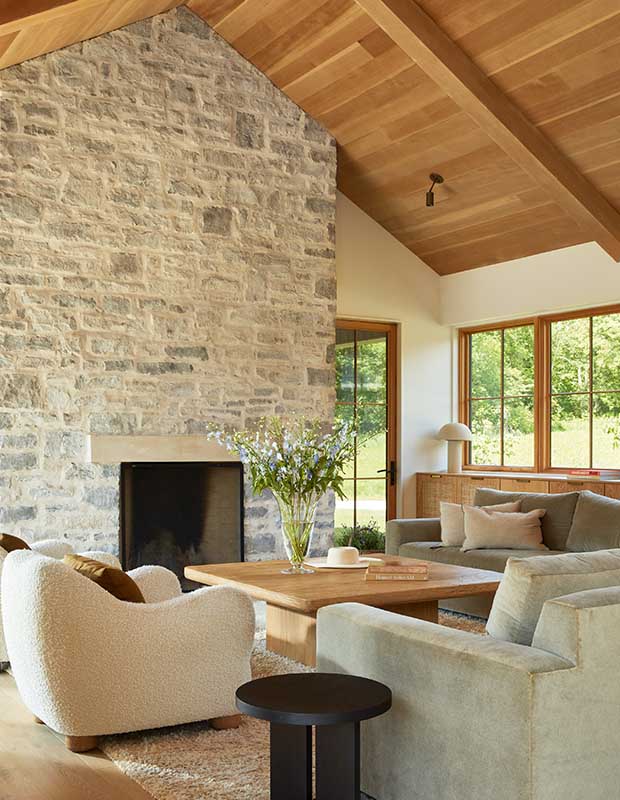 Les tons du revêtement de sol en pierre sont utilisés sur la paroi de la cheminée, mais le carrelage raffiné à l’intérieur de l’âtre permet d’éviter un style trop rustique.