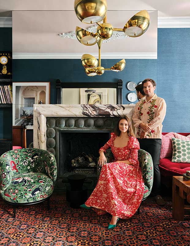 Les propriétaires Katherine et Zane Mersky (sur la photo) étaient décidés à se lancer dans l’aventure du design avec des couleurs et des détails spectaculaires. Ils ont confié le mandat au designer Tommy Smythe, nommé designer de l’année 2025 H&H. Le foyer du salon – qui fait la couverture du magazine House & Home de novembre – est inspiré d’un manteau de cheminée des années 1880, en cuivre patiné avec un encadrement en marbre. Colin Baird, designer et chef de projet de Tom design collective, était chargé de trouver un fabricant et de la faire installer. Ce fut un véritable défi.
