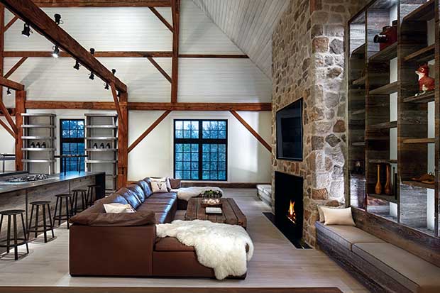 La pierre naturelle entourant la cheminée de ce grand salon d’un chalet de Muskoka, en Ontario, intègre une partie du paysage dans sa décoration. La couleur du charbon de bois est répétée sur les chaises opposées au foyer.