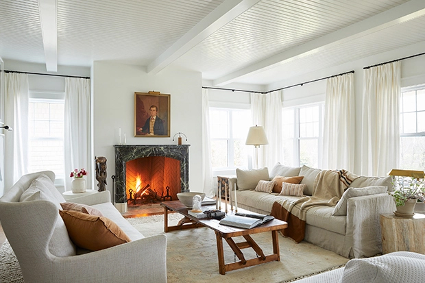Dans la même demeure, la cheminée en briques et les murs en lambris sont agencés à un sofa d’un blanc éclatant.