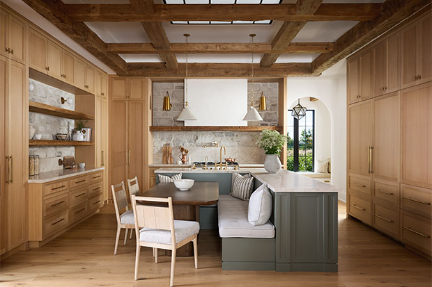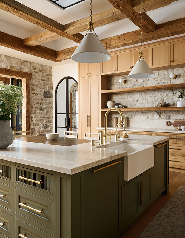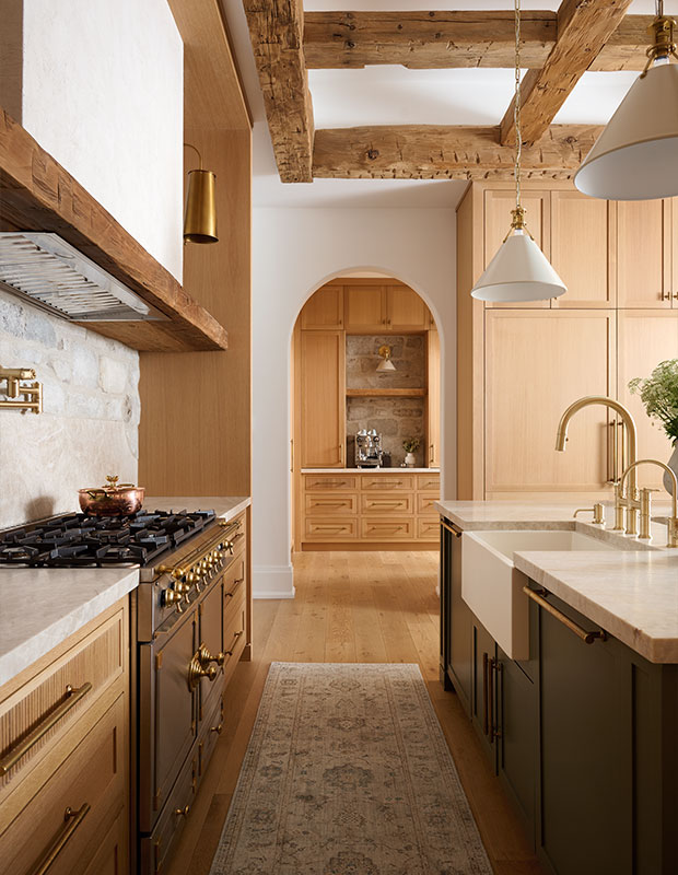 Pour créer une véritable ambiance farmhouse, des poutres de grange taillées à la main, récupérées dans des maisons et des granges des années 1800, ont été intégrées à la construction, constituant les éléments essentiels de la cuisine. Elles s’entrecroisent au plafond, encadrent les portes et servent d’étagères. Les armoires sur mesure sont en chêne blanc au grain fin et linéaire ; Stéphanie ne voulait pas d’une finition peinte qui pourrait s’écailler.