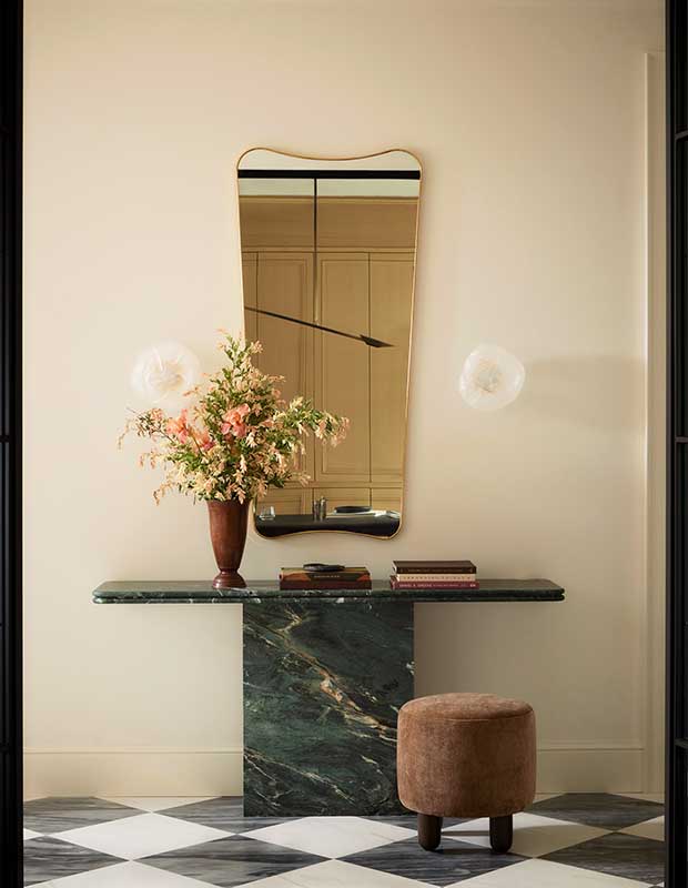 Le sol en marbre à carreaux de dolomite et de Bardiglio Dark et la console en marbre Verde Alpi contribuent à créer une ambiance accueillante dans le hall d’entrée. Miroir, Gubi ; appliques, Bocci.