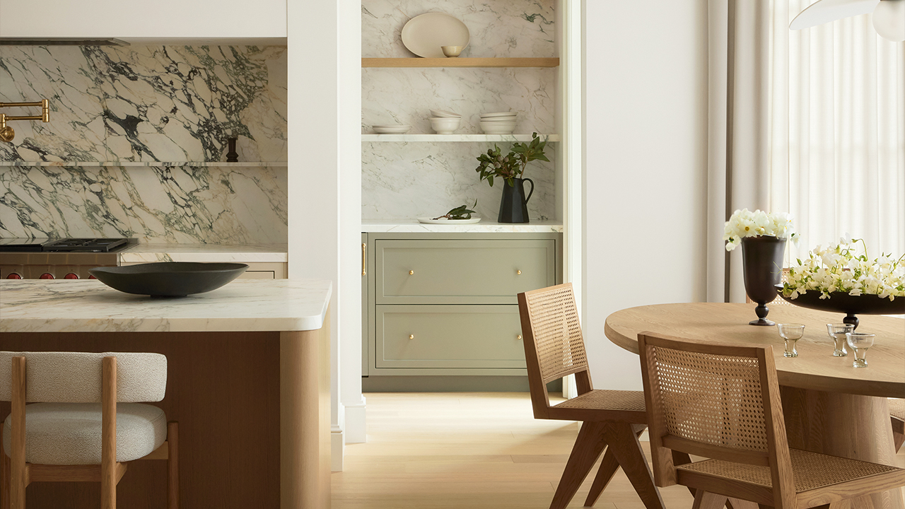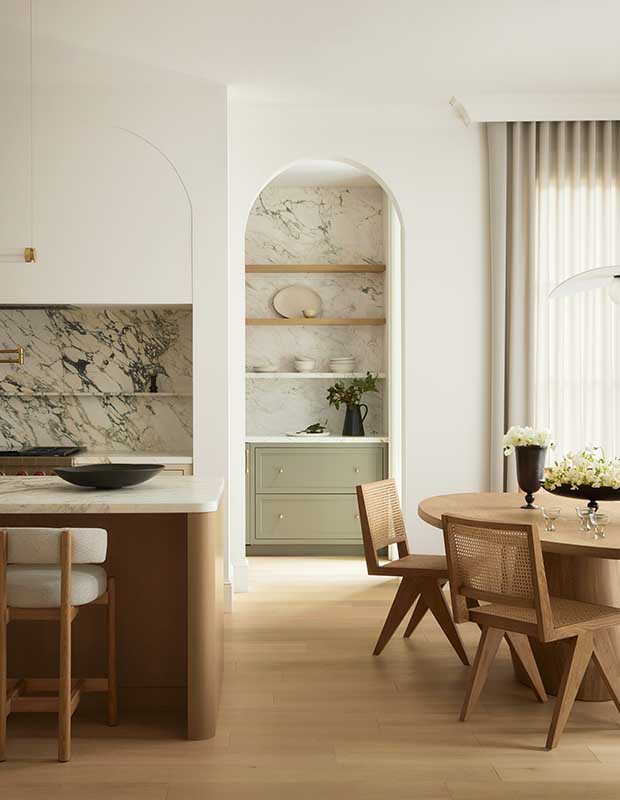 Pour Elyssa, il y a de quoi aimer : « Mes clients ont insisté pour que des touches subtiles de couleur soient présentes partout ; j’adore le vert pâle du coin repas et les chaises rose pâle du salon », dit-elle. La designer a également ajouté un luminaire spectaculaire de Gabriel Scott au-dessus de l’îlot de cuisine. « Mais ce sont vraiment les éléments discrets qui rendent cette maison si belle. »