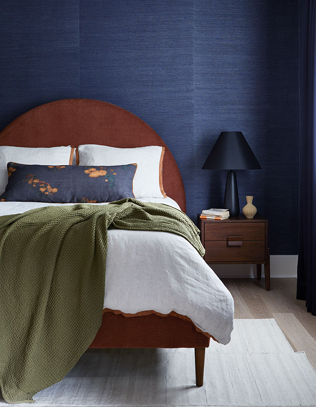 Une tête de lit en velours brun brûlé complète le revêtement mural en toile de jute bleue de cette chambre, tandis que les draps blancs aux bords caramel harmonisent l’ensemble.