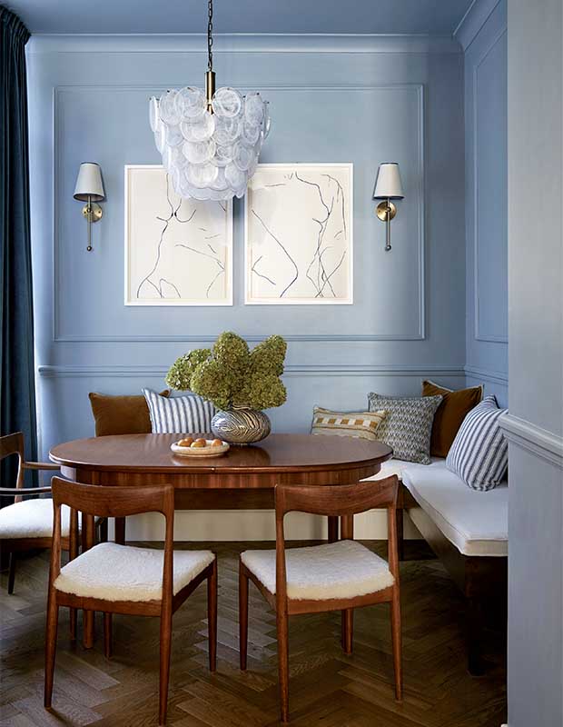 Les coussins sont un moyen facile et sans risque d’introduire cette nouvelle couleur neutre à un décor. Plus doux que le noir et plus chauds que le blanc, les coussins bruns s’harmonisent à merveille avec le bleu clair de ce charmant coin repas.