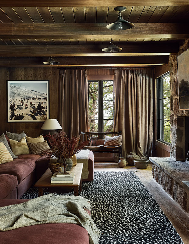 Ce sous-sol de ce bungalow conçu par Ashley Montgomery est habilement décoré dans des tons bruns, avec notamment des panneaux en noyer riche et des rideaux somptueux qui ajoutent de la profondeur et renforcent l’atmosphère cocooning de la pièce, plus que parfaite pour les soirées cinéma.