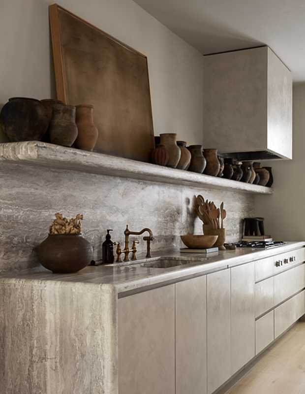 Un mélange de céramiques vieillies est un moyen facile et peu contraignant d’introduire du brun dans un espace sans avoir recours à du sur-mesure. Regroupées, ces pièces aux tons harmonieux ajoutent de la chaleur, de la profondeur et une touche rustique.