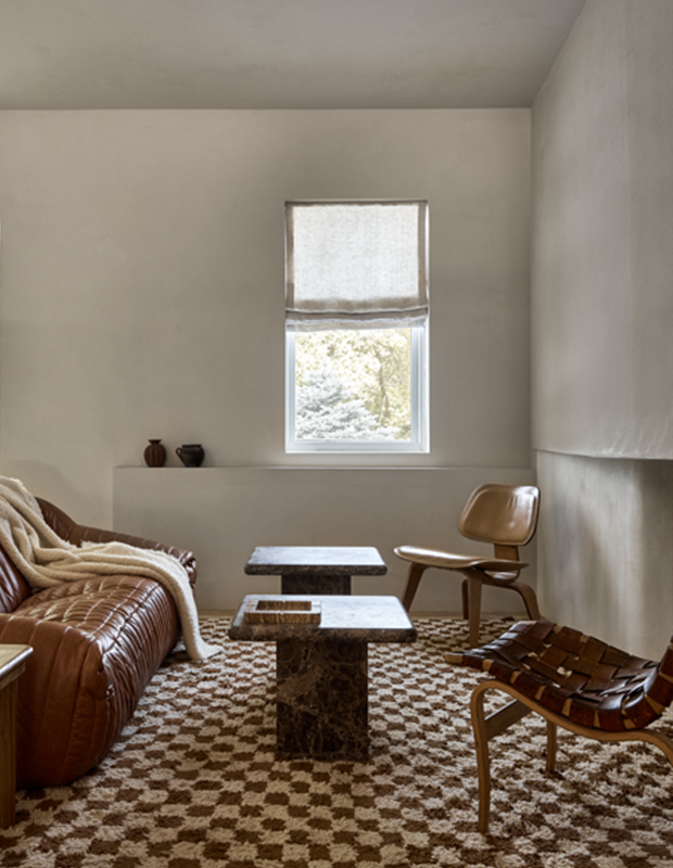 La designer Montana Labelle est connue pour créer des intérieurs aux tons terreux agrémentés d’éléments vintages. Le tapis à carreaux marron de ce salon apporte une note nostalgique et tendance à la fois, pour un look naturellement cool.