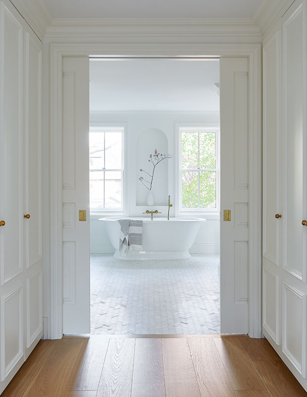 Deux nouvelles rangées de placards mènent de la chambre principale à la salle de bains attenante ; des portes coulissantes doubles encadrent la vue sur la baignoire.