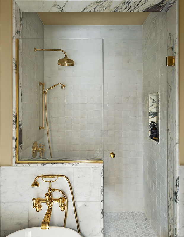 La cabine de douche et la niche sont encadrées de marbre Calacatta Monet veiné, et les accessoires en laiton ont un aspect antique.