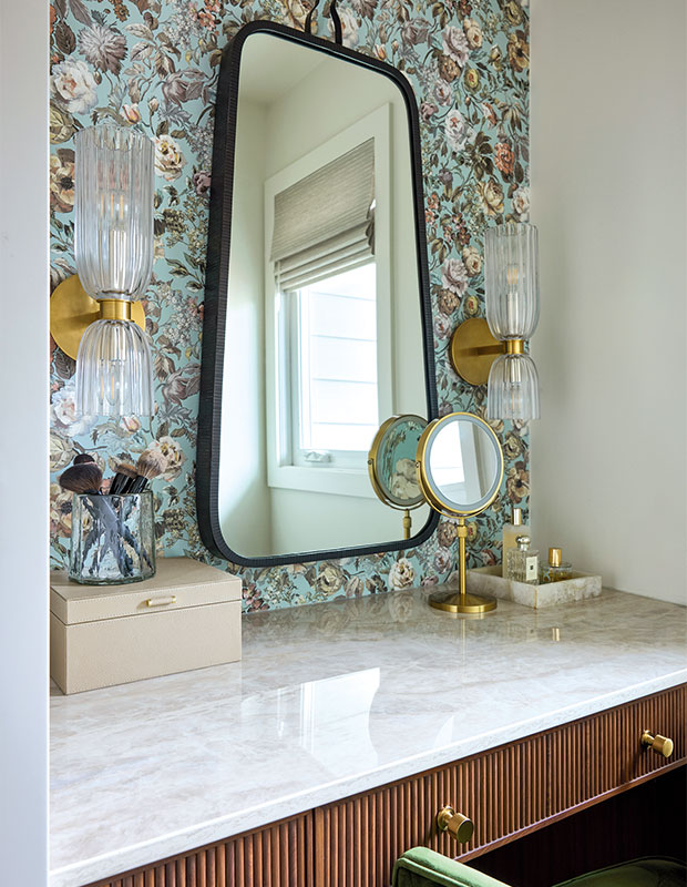 Un papier peint floral habille la niche, tandis que de délicates appliques cannelées viennent encadrer le miroir avec raffinement.