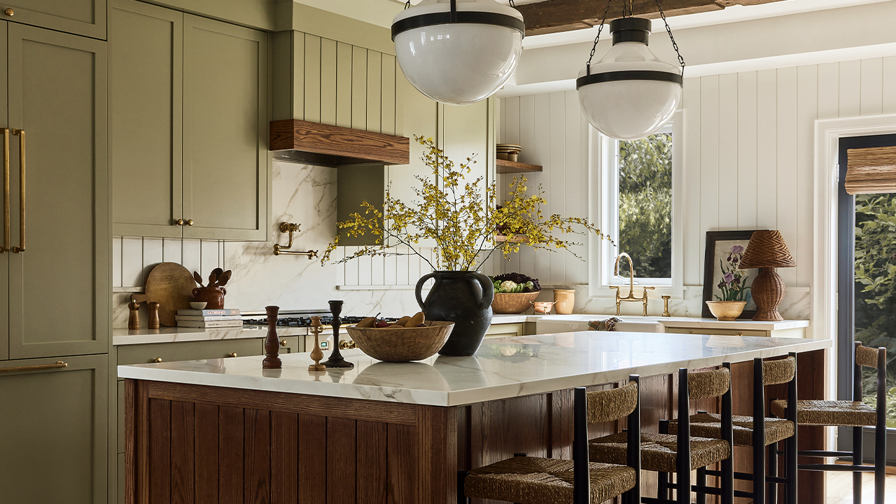 NE vous contentez PAS de trois luminaires suspendus au-dessus de l’îlot. Pour un look plus contemporain, essayez un long luminaire linéaire ou osez un seul luminaire surdimensionné. Suspendu à une extrémité de l’îlot et mesurant au moins un tiers de sa largeur totale, il créera un point focal saisissant tout en maintenant l’équilibre des proportions de la pièce.