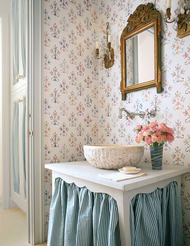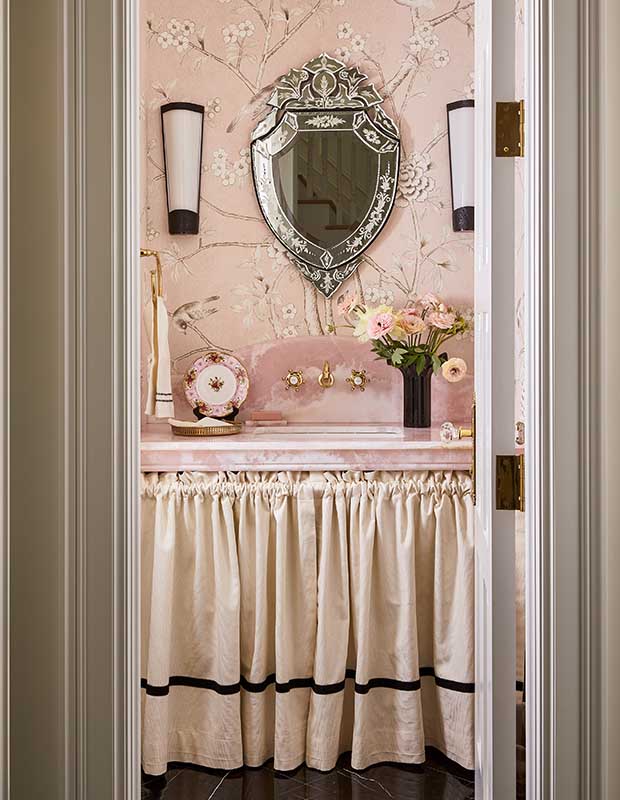 La tendance au maximalisme n’est pas près de disparaître, et la salle d’eau n’échappe pas à son charme. Ajouter une jupe à volants au-dessus d’un lavabo ou d’un meuble-lavabo est un moyen simple de créer un effet spectaculaire et d’apporter une touche féminine à l’espace. Un papier peint à fleurs de cerisier et un plan de travail en marbre rose sont associés à une jupe simple rehaussée d’un ruban gros-grain noir. Le miroir vénitien orné est tempéré par des appliques contemporaines qui ajoutent une touche de noir supplémentaire.