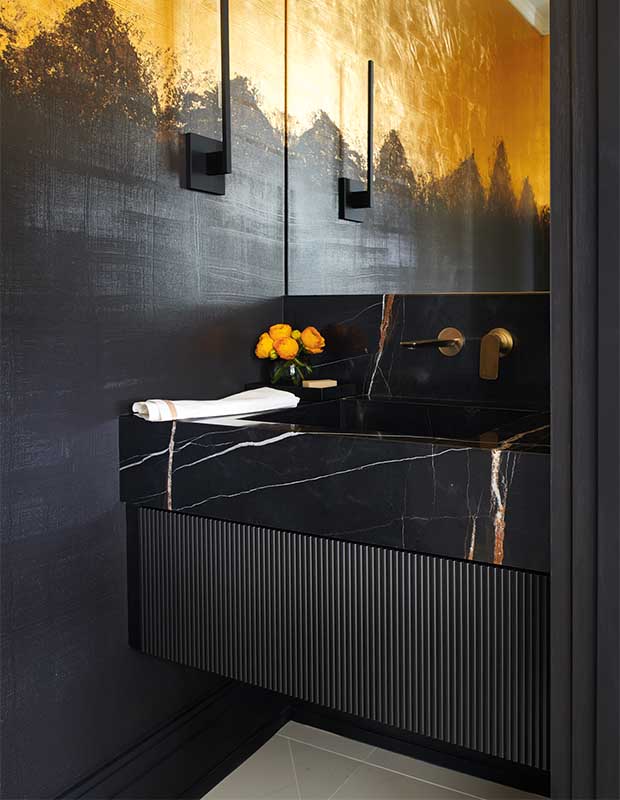 Les lavabos dernier cri s’étendent sur toute la largeur de la pièce, remplaçant complètement le meuble-lavabo traditionnel. Comme la plupart des salles d’eau ne nécessitent pas beaucoup de rangements, c’est l’endroit idéal pour essayer cette tendance. Les murs à finition imitation, réalisés à l’aide de peinture noire et de feuille d’or, s’harmonisent à merveille avec un lavabo en marbre foncé. Le tablier nervuré du lavabo apporte une touche de texture bienvenue.