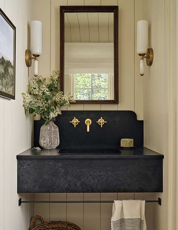 S’étendant entre des murs lambrissés, ce lavabo en quartz noir est rehaussé par des robinets en laiton et associé à un porte-serviettes sur mesure.