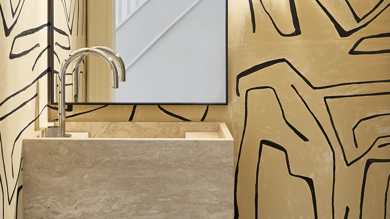 On voit souvent deux appliques encadrer un miroir dans une salle d’eau, mais que se passe-t-il si l’on n’en utilise qu’une seule ? L’effet peut être très dynamique, surtout si l’on prête attention à la façon dont le miroir, le lavabo et l’applique interagissent. Au lieu de centrer ce lavabo monumental en pierre dans l’espace, la designer l’a décalé vers le mur de gauche, laissant de la place sur le côté droit pour une seule applique. Cette disposition unique crée un triangle harmonieux entre les éléments.