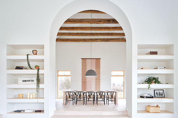 Une grande arche encadre la salle à manger voûtée, qui se caractérise par de hauts plafonds et des poutres rustiques. La tapisserie tissée à la main apporte de la chaleur à l’espace.