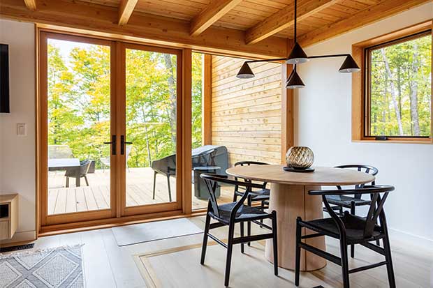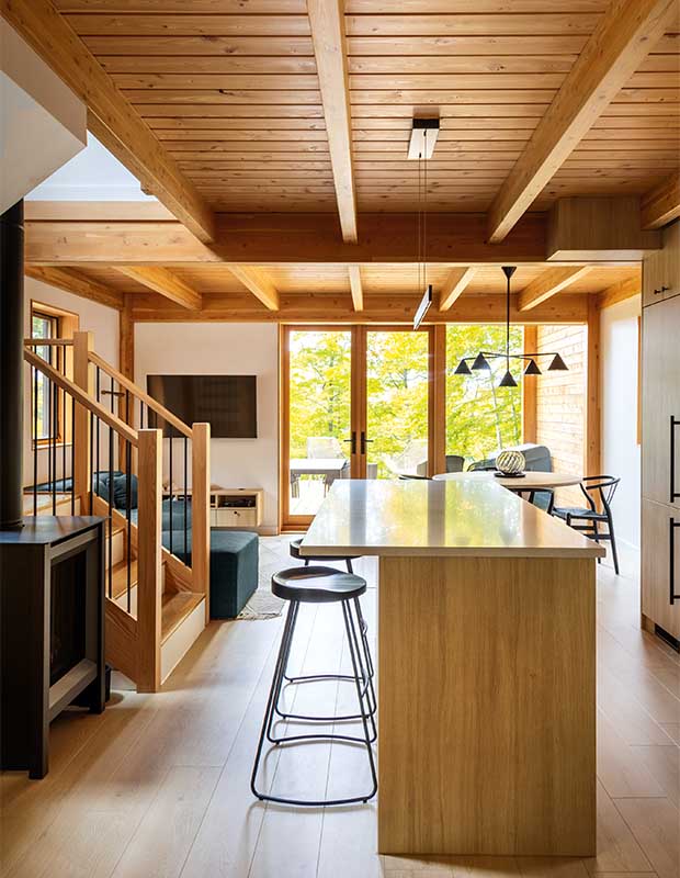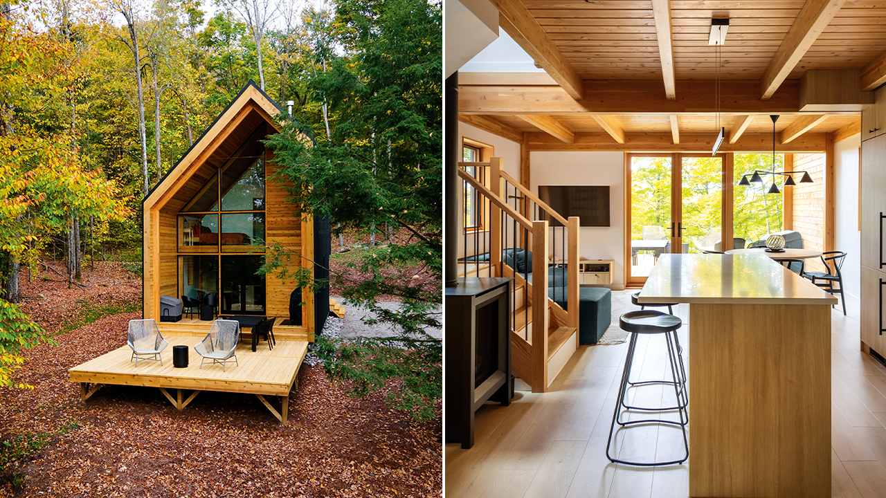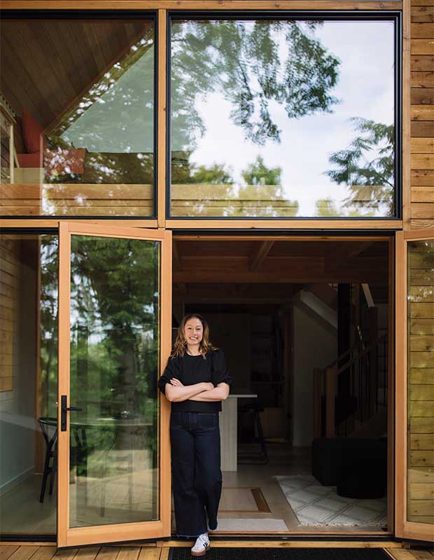 La grande majorité des gens n’ont guère d’occasion d’apercevoir des loups dans la nature. Cathy Cicchini, en revanche, en a tout récemment observé un passer devant sa porte d’entrée. La directrice de création et son mari, Mike Cicchini, qui vivent à Richmond Hill, en Ontario, ont construit leur cabine préfabriquée au bord du lac Long, à Haliburton, en Ontario. Compacte, élégante, épurée et sobre à souhait, elle est nichée sur les flancs de granit du Bouclier canadien, au cœur de la forêt.