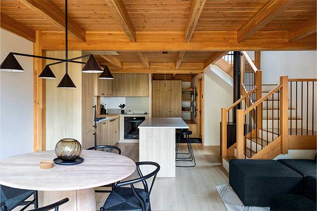 La structure moderne à deux étages allie le caractère canadien à la sérénité scandinave : le revêtement métallique noir, les plafonds en sapin Douglas, les fenêtres du sol au plafond et l’absence de rideaux se combinent avec le bois blond, les murs blancs et les touches de noir pour créer une ambiance nordique propice à la méditation.