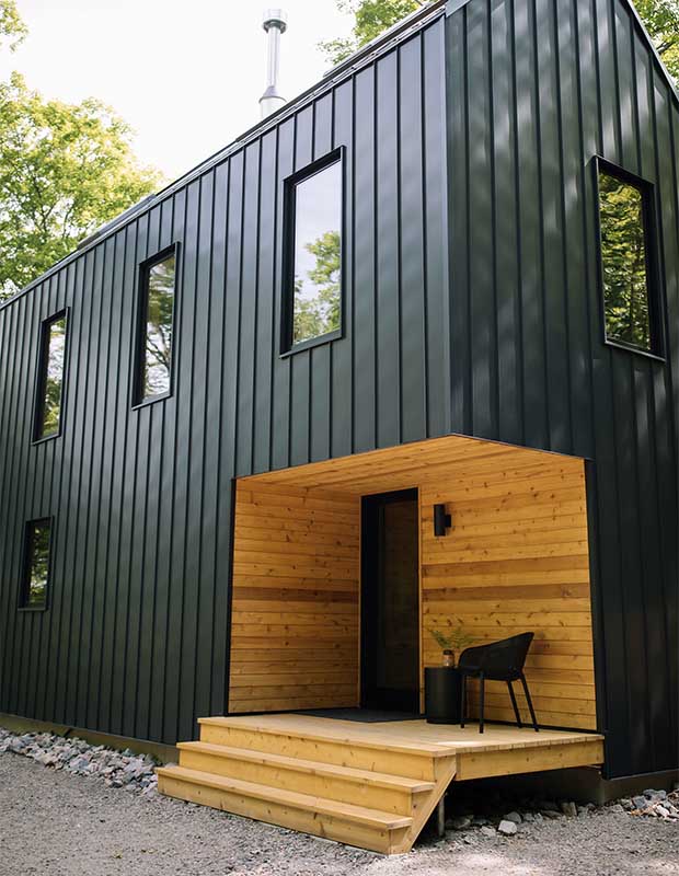 L’entrée principale semble avoir été découpée dans la structure et est rehaussée de cèdre, qui contraste avec la tôle sombre. « La cabane est tellement impressionnante », s’émerveille Cathy. « Chaque fois que j’arrive ici, je me dis : « Waouh ! » »