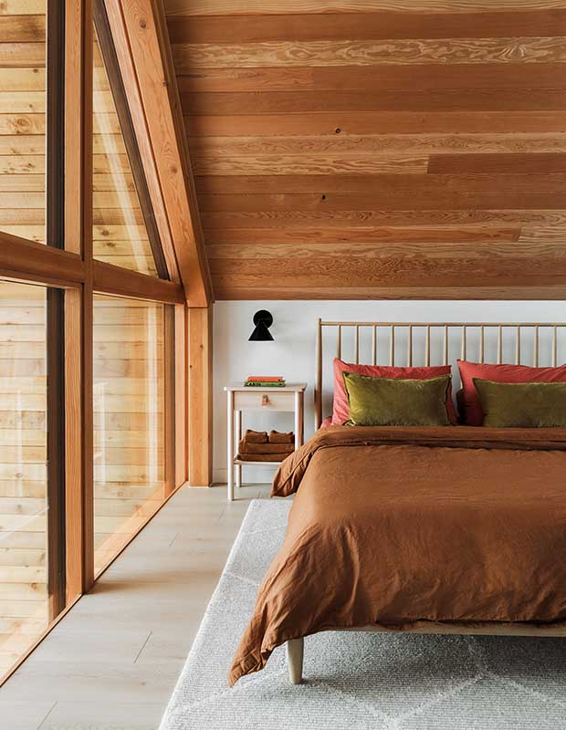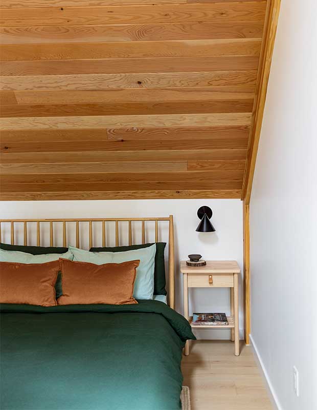 Grâce à la conception bien pensée de la cabane et à l’emplacement judicieux des fenêtres, le couple n’a pas eu besoin que les fenêtres soient habillées pour contrôler la lumière ou la chaleur. « Nous ne sommes jamais éblouis par les rayons du soleil ni réveillés par eux, c’est juste une lumière douce et tamisée », explique Cathy. Nichée au milieu des arbres, la cabane offre naturellement de l’intimité.