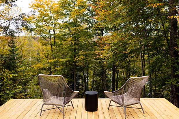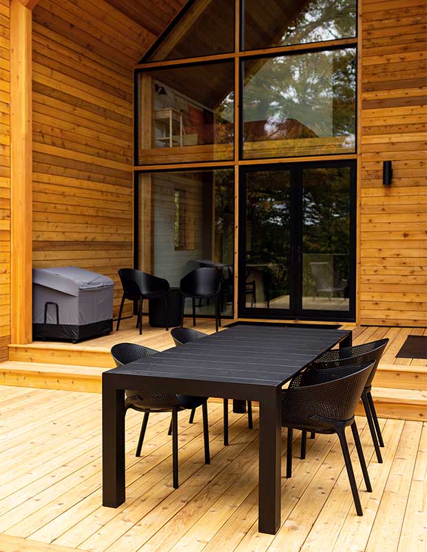 Le mobilier d’extérieur noir contraste avec le revêtement en cèdre et la terrasse en sapin de Douglas.